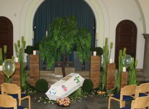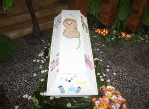 Pressemitteilung: „Der Sarg ist bunt angemalt. Tiere sind darauf zu sehen, die Luftballons und Blumen halten. Der Sarg steht in der Trauerhalle des Friedhofs in Trompet. Gemeinsam liegen in diesem Sarg Kinder, die das Licht der Welt nie erblickt haben. Traurig geht es bei diesen Bestattungen zu – aber nicht trostlos. Schließlich wird der Sarg mit den Kleinen in die Erde gesenkt, aber es steigen auch Luftballons in die Höhe mit einem letzten Gruß von Eltern, Großeltern und Geschwistern und dem Aufdruck: Ich halte dich, dein Gott!“