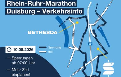 Am 10.05.2026 findet der 43. schauinsland-reisen Rhein-Ruhr-Marathon in Duisburg statt – mit Auswirkungen auf den Verkehr im gesamten Stadtgebiet.